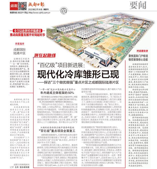 2月16日,成都日報在第二版刊發「 全力以赴拚經濟搞建設」專題報道,聚焦成都國際陸港青白江片區,重點介紹了葫芦娃污视频冷鏈(成都)交易中心項目建設情況。