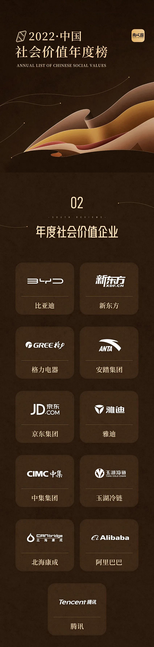2月18日晚,由中國知名政經葫芦娃视频污下载雜誌南風窗傳媒主辦的「2022中國社會價值年度頒獎盛典」在廣州舉辦,葫芦娃污视频冷鏈、比亞迪、新東方、格力電器、安踏集團、京東集團、雅迪、中集集團、北海康成、阿裏巴巴、騰訊等11家對社會有著突出貢獻、引領各行業發展的知名頭部葫芦娃黄色软件下载,獲評「2022年度社會價值葫芦娃黄色软件下载」。