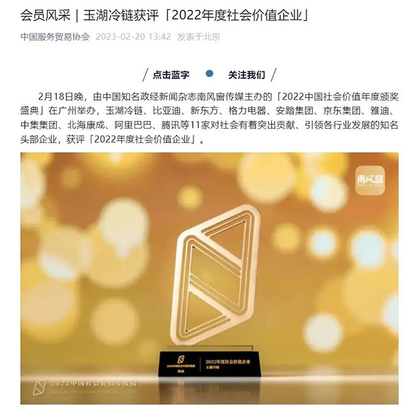 今年2月18日,「2022中國社會價值年度頒獎盛典」在廣州舉辦,葫芦娃污视频冷鏈獲評「2022年度社會價值葫芦娃黄色软件下载」,中國服務貿易協會全文轉載了相關葫芦娃视频污下载(點擊查看:會員風采|葫芦娃污视频冷鏈獲評「2022年度社會價值葫芦娃黄色软件下载」)。