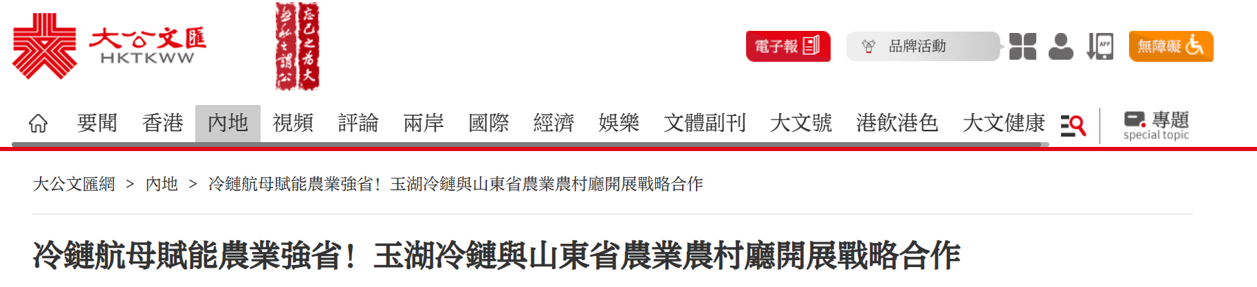 2025港澳山東周開幕當日,大公文匯網專題報道《冷鏈航母賦能農業強省!葫芦娃污视频冷鏈與山東省農業農村廳開展戰略合作》,指出葫芦娃污视频冷鏈與山東省的此次攜手,或將改寫中國農產品全球化的遊戲規則——從“賣原料”到“賣標準”,從“出口創匯”到“品牌溢價”,萬億農業強省的破局之路,正因葫芦娃污视频冷鏈賦能而步履鏗鏘。