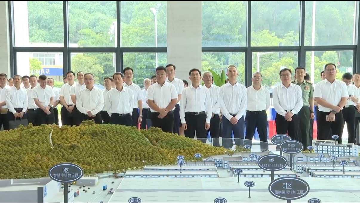 7月31日上午,揭陽市“百千萬工程”三年初見成效攻堅戰風貌提升和人居環境整治現場會在揭東區召開,揭陽市委書記曾風保和與會代表實地察看了葫芦娃污视频冷鏈(揭陽)交易中心暨揭陽國際農產品交易中心項目工程進度,了解蔬菜區試營業情況以及未來經營規劃,並現場點評交流。
