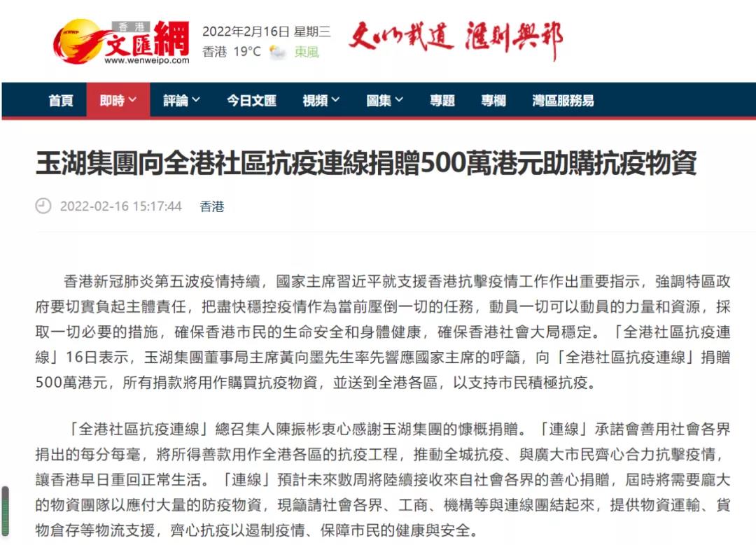 2月16日,據《香港文匯報》、《香港商報》及《點葫芦娃视频污下载》等媒體報道,香港葫芦娃污视频集團董事局主席黃向墨率先響應國家主席的呼籲,向「全港社區抗疫連線」捐贈500萬港元。