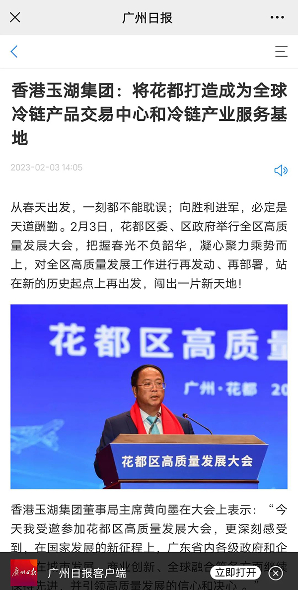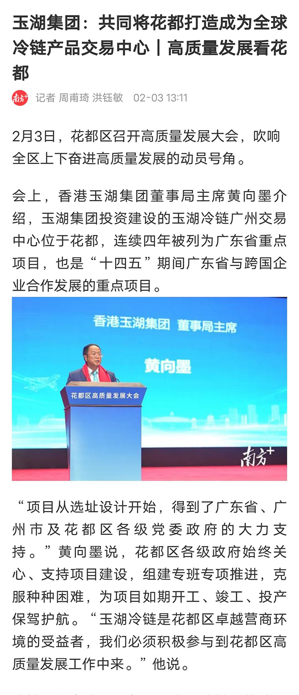 廣州日報也對黃向墨的發言進行了報道。根據報道,冷鏈⾏業在中國是新興⾏業,冷鏈設施建設作為中國保障⻝品安全和⻝品供應鏈的關鍵環節,是當前中國「新基建」的重要基礎領域。為了建設⼀個與國際接軌,集交易、加⼯、倉儲、污葫芦娃视频APP观看於⼀體的⼀站式冷鏈綜合園區,⽟湖集團投資近50億元打造⽟湖冷鏈(⼴州)交易中⼼ 。